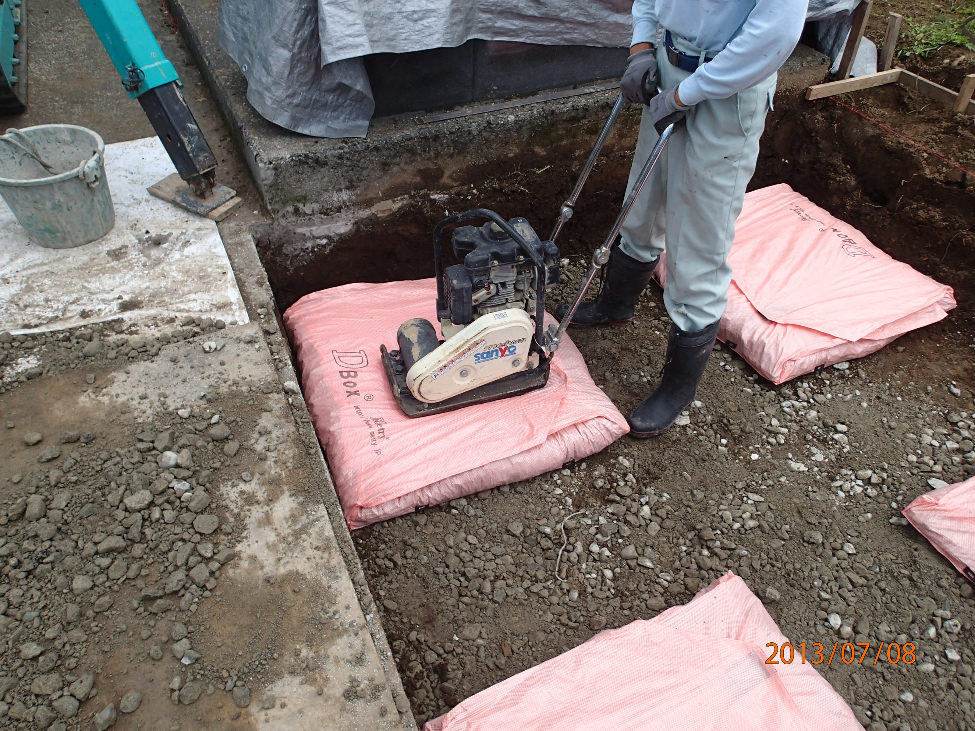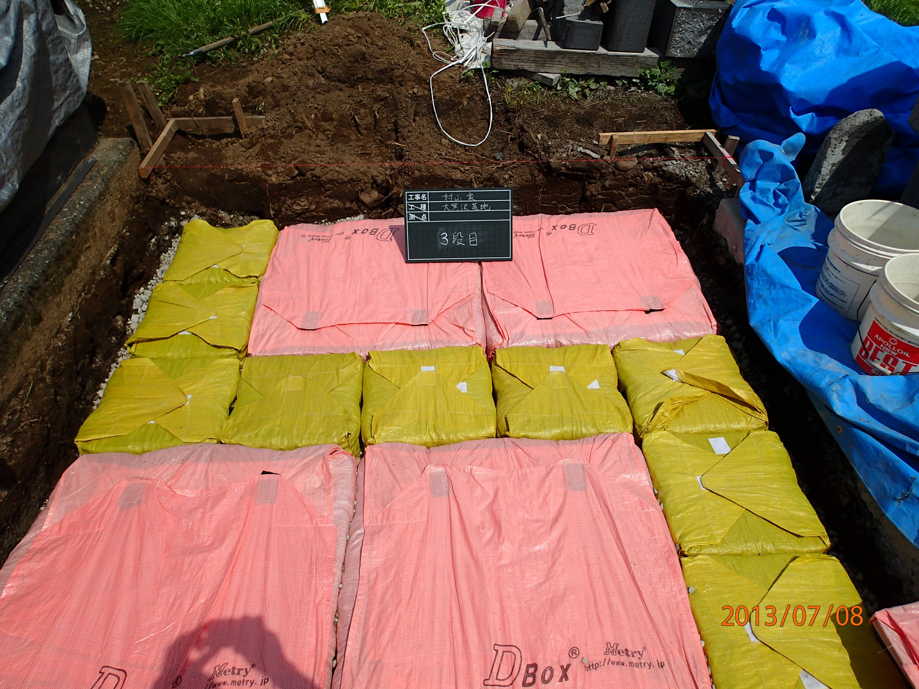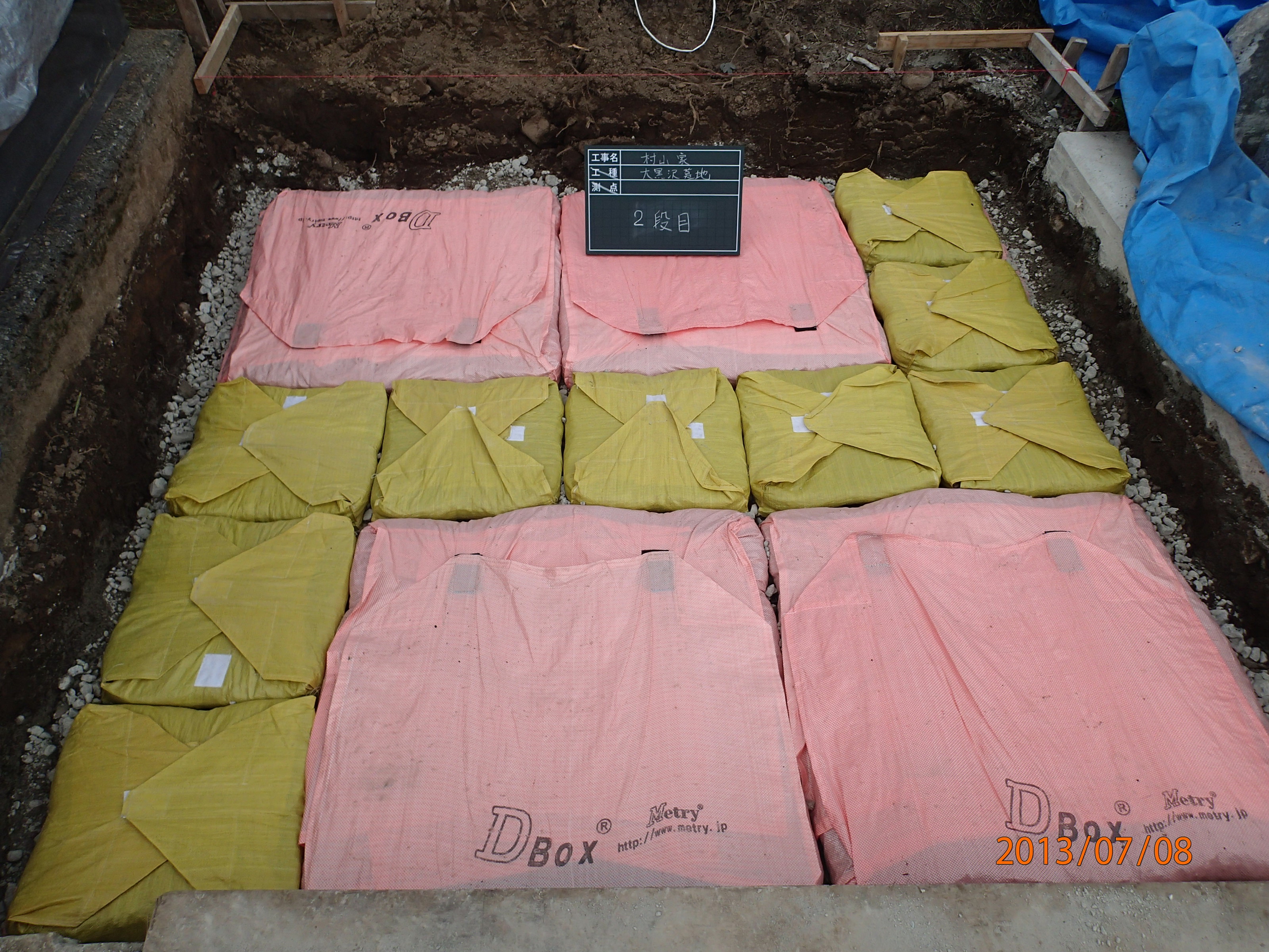 砕石の入った土のう、ソイルバッグ、D・BOXは、水だけを通して土粒子を通さない排水層にもなるので、その直下の軟弱地盤を局所的に圧密させる。この「局所的な圧密」は、上載荷重に合わせて土のう直下から必要な分だけ圧密させるので、沈下量も小さく、沈下の収まる時間も短くなるということが、現場実験と解析計算(広島大学山本春行による)によって分かっている(特に、即時沈下後の沈下の収まる時間が極めて短いのは注目に値する)。土のうやD・BOXの直下に何も入れなくても、いわば勝手に上載荷重に合わせて自然に地盤が強くなっていくというのは面白い(ただし、子供にいきなり大きな荷物を担がせられないように、現在の荷重と同じ程度の荷重増分にとどめないと地盤が破壊する可能性があるので注意を要する! 状況によっては現場で沈下計測をすべきである)。 D・BOX にガイドゲージと呼ばれるプラスチック製の枠をはめこむ作業を障害者施設にお願いし、通常の手間賃の数10倍の費用をお支払いして障害者の自活を支援するものです。 |
